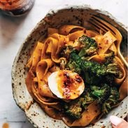 Chili Garlic Pappardelle with Smashed Broccoli and Soft Eggs