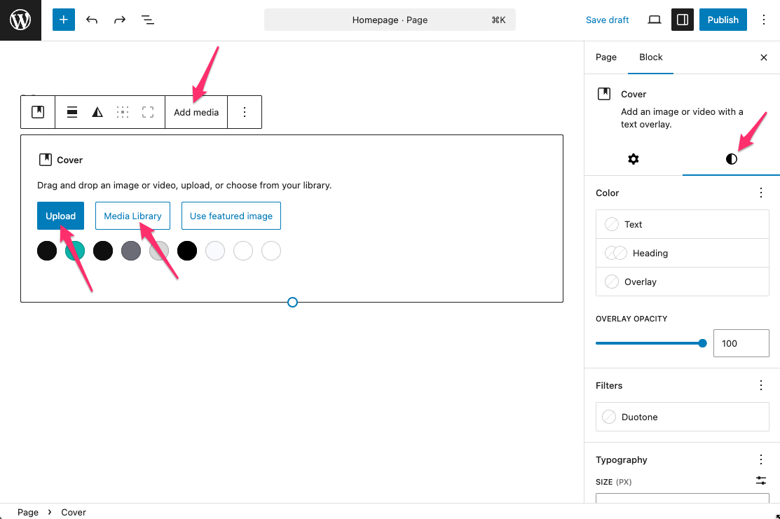 In the Style tab, you can customize the colors, typography, and other settings of the cover block.