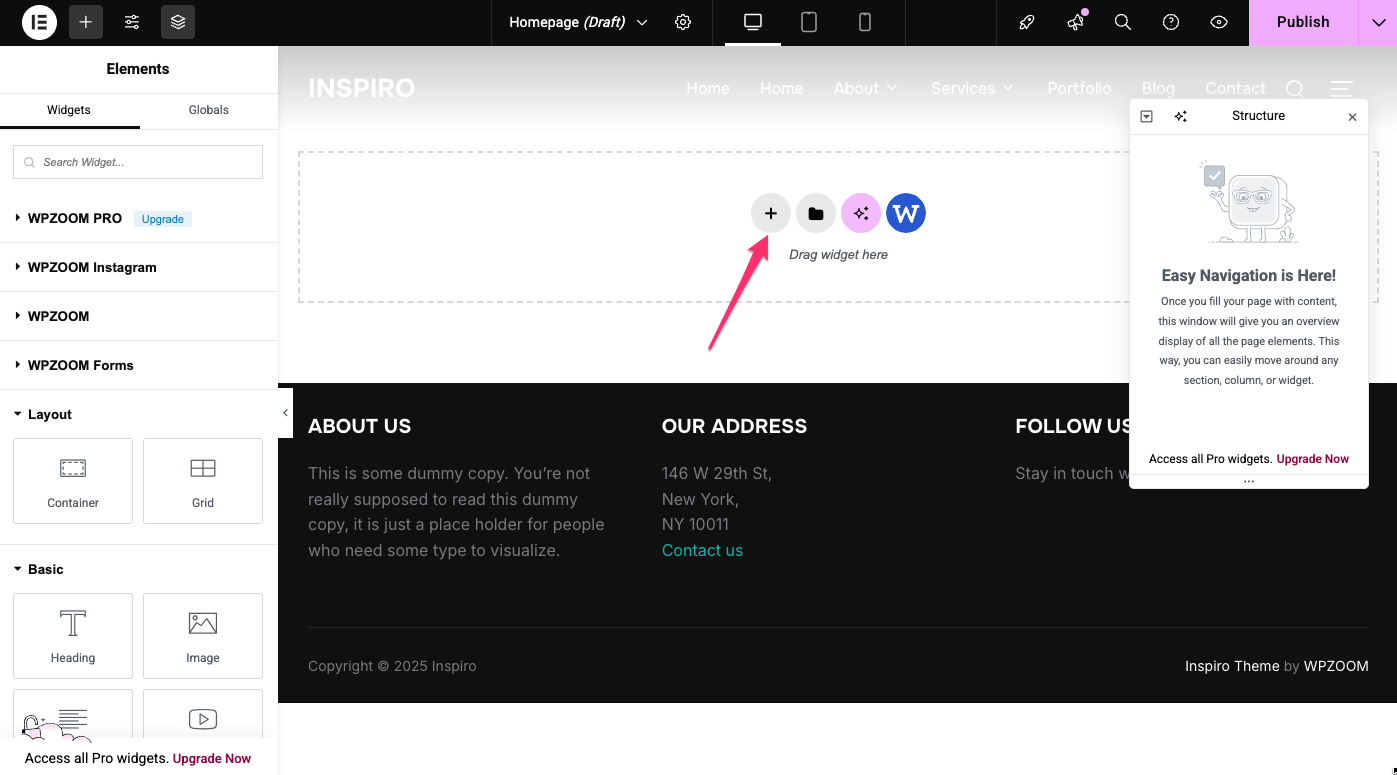 The Hero Area is the large section at the top of your homepage. In Inspiro Lite, you can add a video background using the Block Editor or Elementor. The easiest way to get started is by importing a Starter Site and editing the homepage. You can also create a new page from scratch with a custom page template from the theme.
