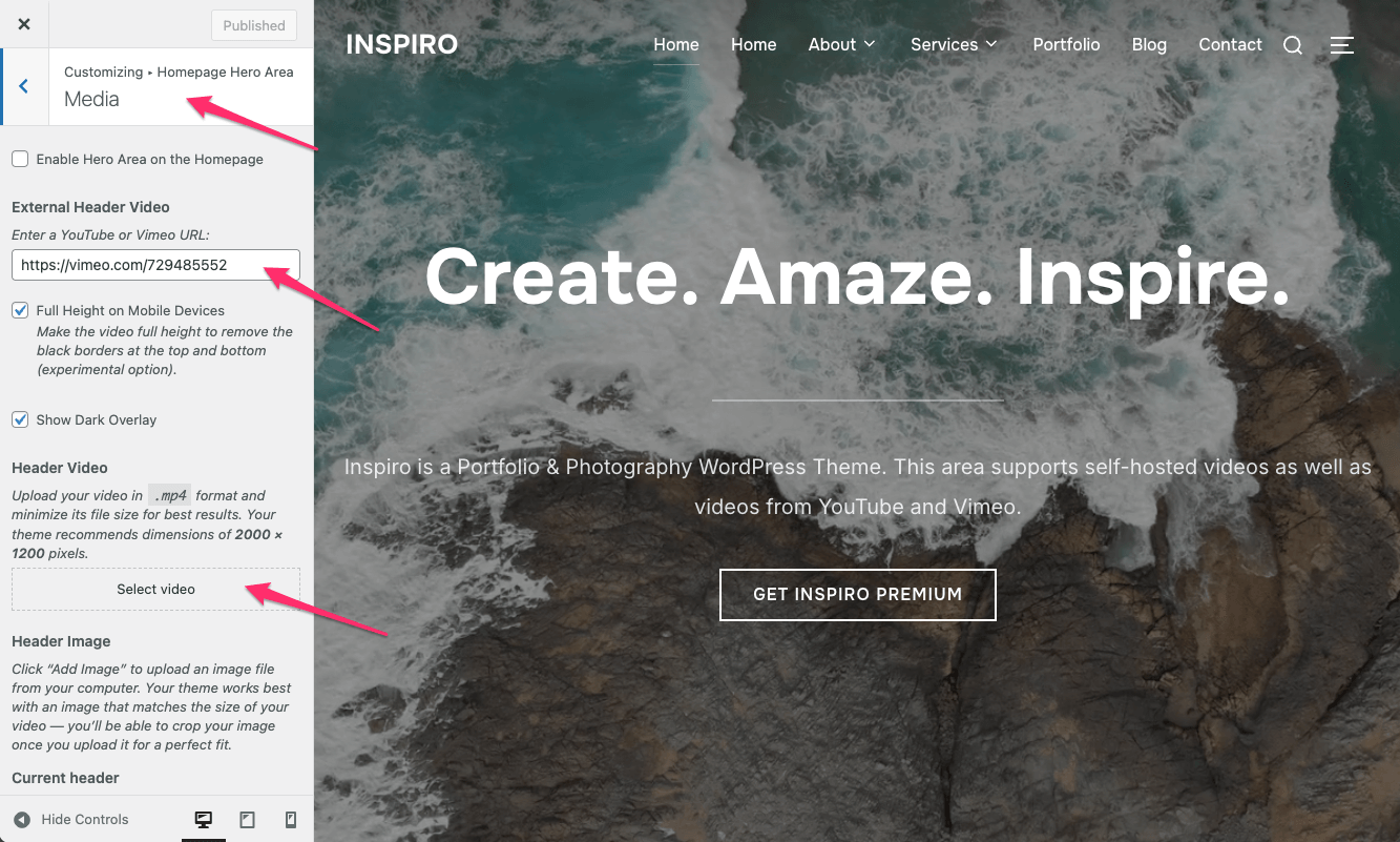 Inspiro Lite includes the basics for setting up a Hero Area with video backgrounds.