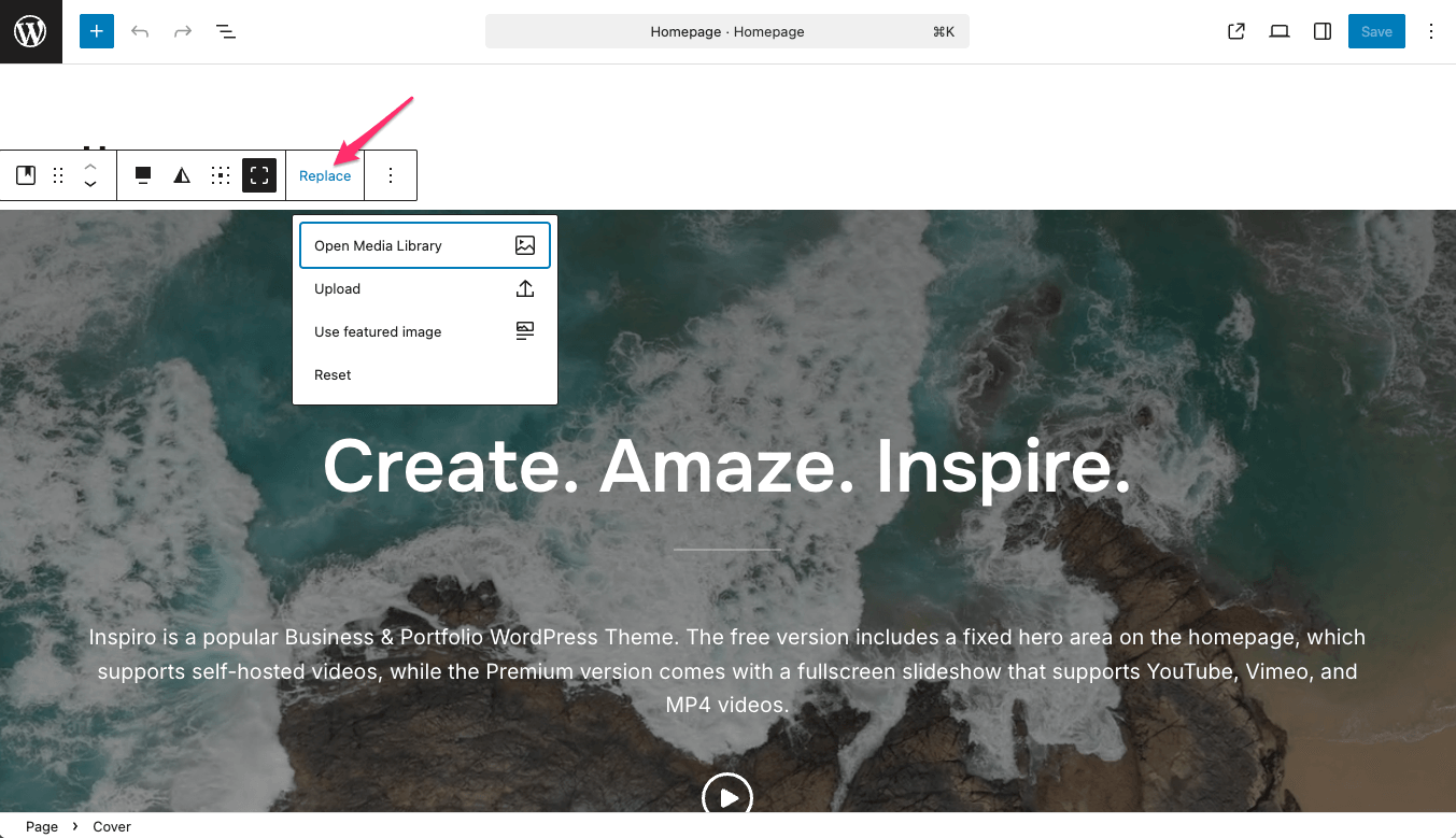 If you imported a Block Editor Starter Site, open the homepage and edit the existing Cover Block. Replace the demo video with your own.