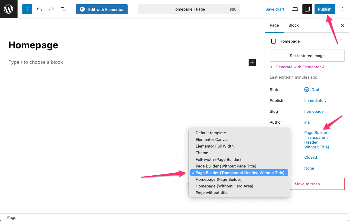 3. In the Page Attributes → Template section, select Page Builder (Transparent Header, Without Title).