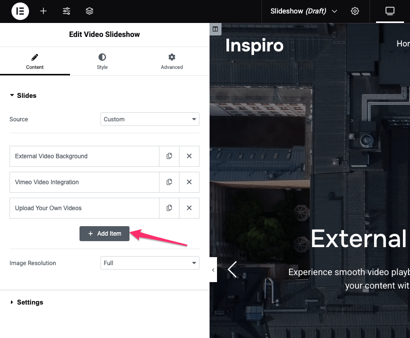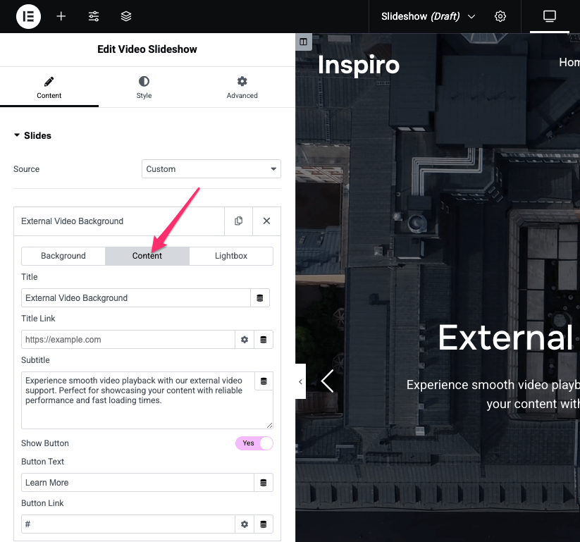 After adding the Video Slideshow widget to your page, the widget’s settings will appear in the Elementor sidebar. These settings are grouped into three tabs: Content, Style, and Advanced.