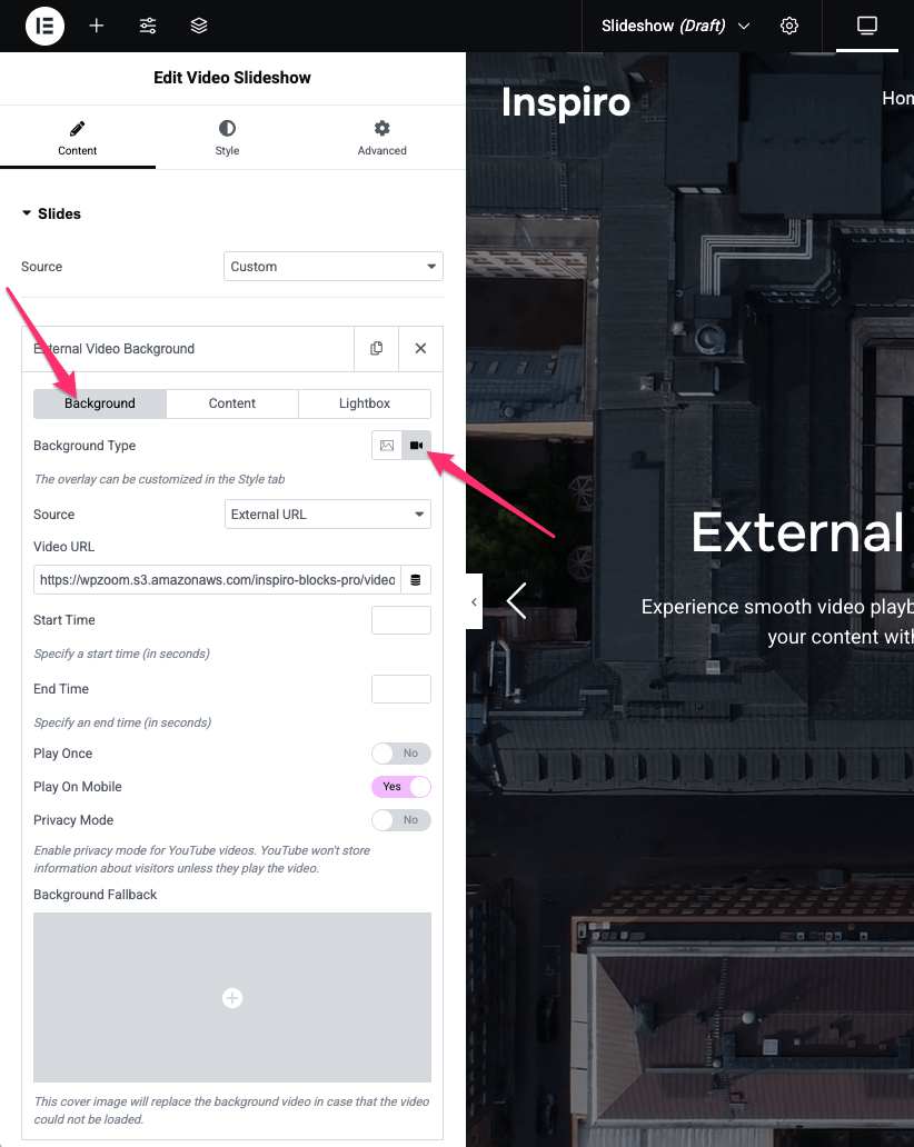 Lightbox: Enable this to display a play icon on the slide. Clicking it opens the video in a lightbox overlay (works with YouTube, Vimeo, or self-hosted videos).